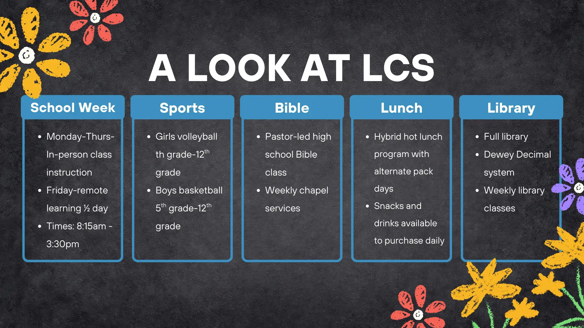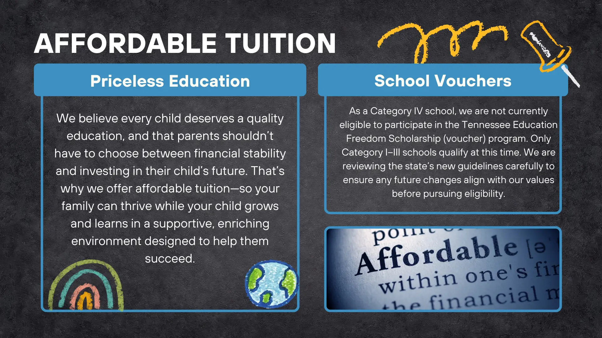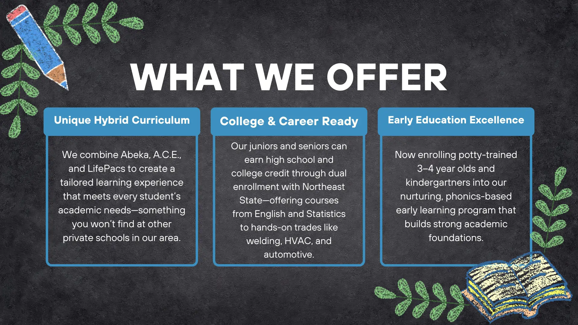 Our mission is to provide affordable, quality education in a Christian environment. We offer small classroom sizes and excellent student to teacher ratios.